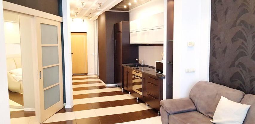 One-Bedroom Apartment with Balcony and Water View. This air-conditioned apartment consists of 1 living room, 1 separate bedroom and 1 bathroom with a bath. Guests can make meals in the kitchen that is equipped with a stovetop, a refrigerator, kitchenware and a microwave. Featuring a terrace with city views, this apartment also provides a washing machine and a flat-screen TV. The unit offers 2 beds.