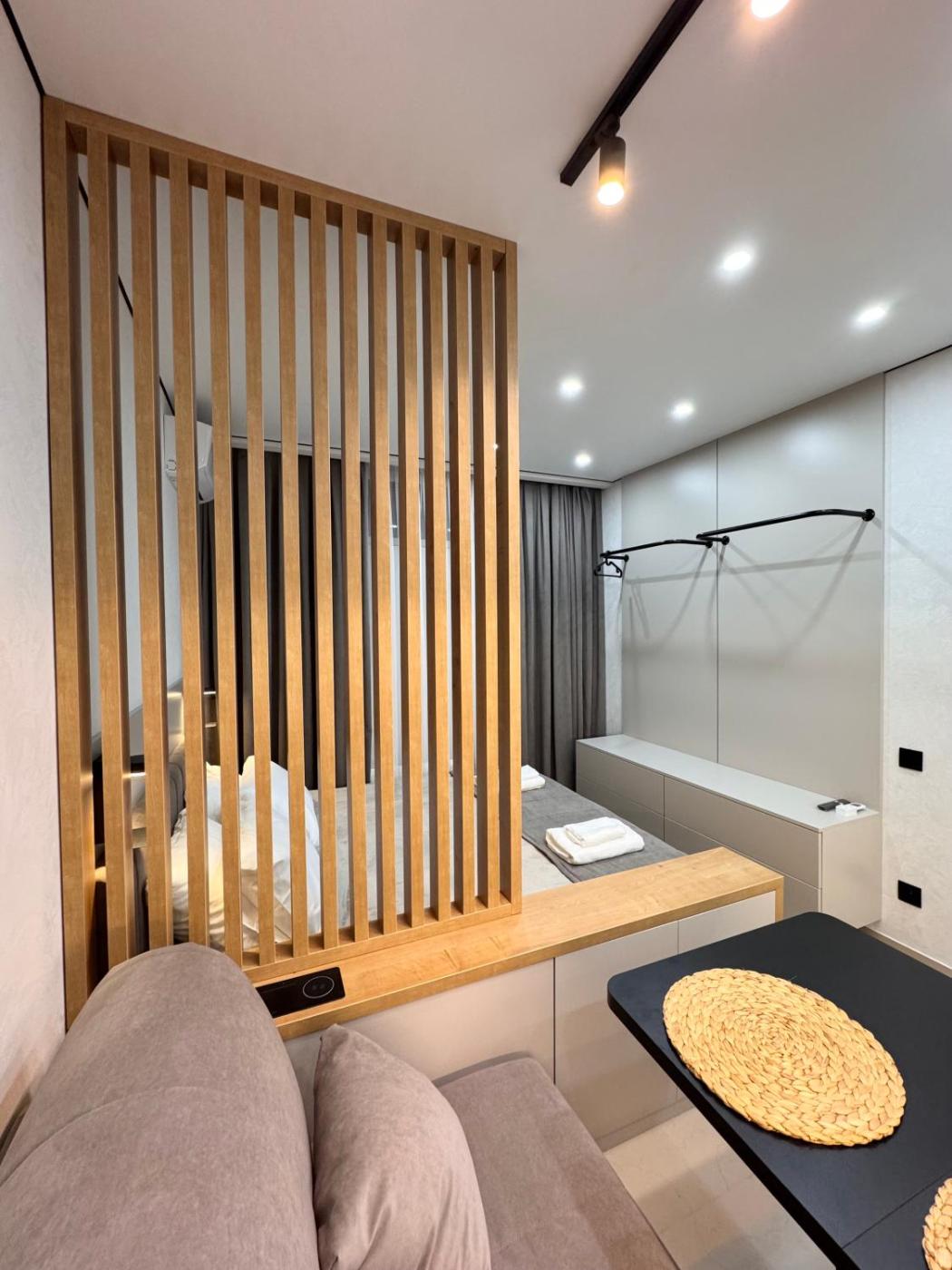 One-Bedroom Apartment. This air-conditioned apartment comes with 1 living room, 1 separate bedroom and 1 bathroom with a shower. The apartments kitchenette is available for cooking and storing food. The apartment features a washing machine, a wardrobe, a sofa, a tiled floor and a flat-screen TV. The unit has 2 beds.
